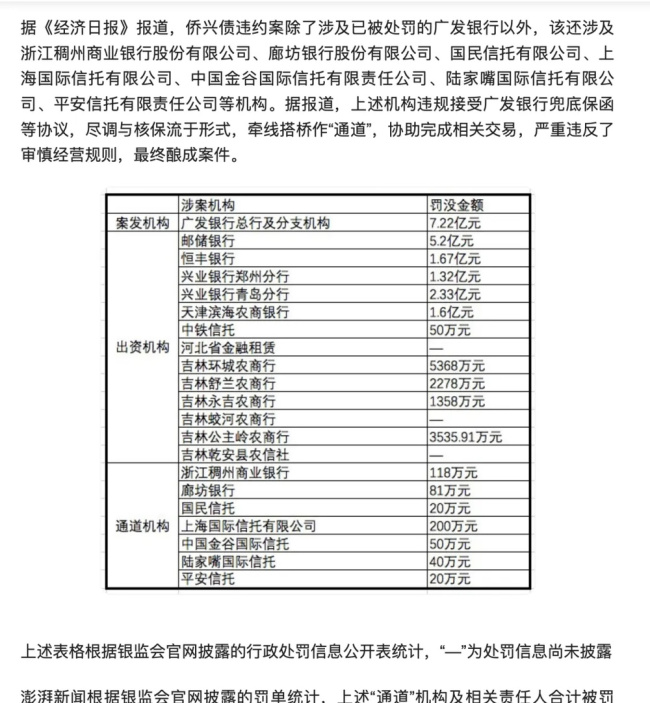 在这一事件中,10多家金融机构拿着广发银行惠州分行出具的托底函,先后向广发银行询问并主张债权。据《经济日报》报道,侨兴债违约案除了涉及已被处罚的广发银行以外,该案还涉及浙江稠州商业银行股份有限公司、廊坊银行股份有限公司、国民信托有限公司、上海国际信托有限公司、中国金谷国际信托有限责任公司、陆家嘴国际信托有限公司、平安信托有限责任公司等机构。据报道,上述机构违规接受广发银行兜底保函等协议,尽调与核保流于形式,牵线搭桥作“通道”,协助完成相关交易,严重违反了审慎经营规则,最终酿成案件(如下图)。