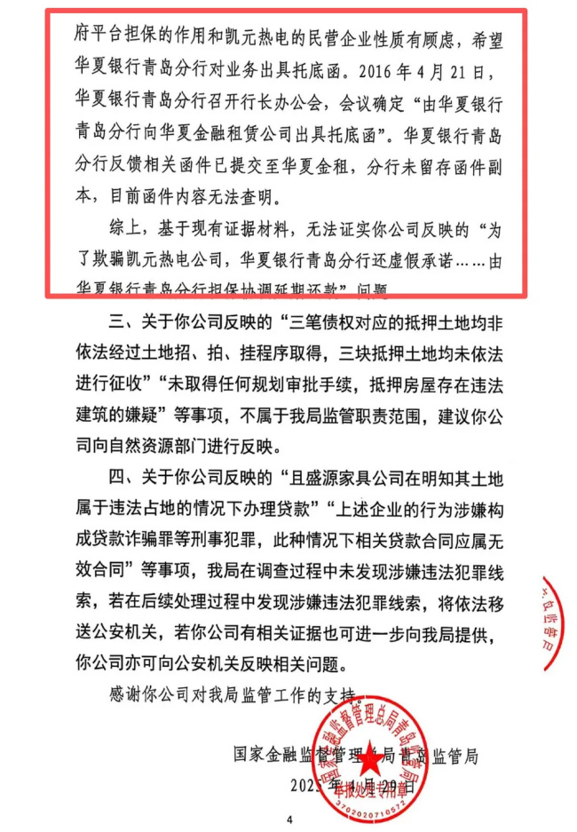 据此,凯元热电表示,金融监管总局和青岛金管局应当依职权调取华夏银行青岛分行涉案行长办公会的会议纪要,一并向华夏金租调取该托底函,进而对该托底函的合法性、合规性进行调查核实认定,应当依法对华夏银行青岛分行确实存在的违反金融监管规定行为给予行政处罚,并认定相关责任人员的违法责任。