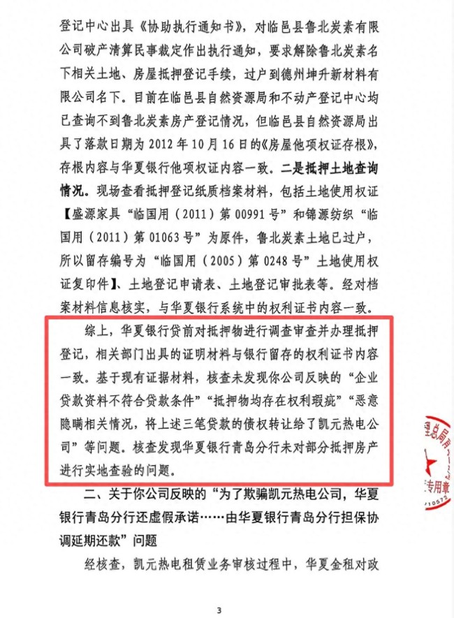 “由于银行未对上述抵押物尽到严格审查义务,而导致这三笔贷款债权收不回,最终造成凯元热电资金链断裂,债台高筑,面临破产的风险。”凯元热电代理律师林宗兵表示,“如果按照正常的银行放贷审核流程,华夏银行青岛分行是不可能不发现上述企业的贷款资料不符合条件的。在如此明显的违规情况下,华夏银行青岛分行依然违法发放了上述三笔贷款,其恶意隐瞒行为导致了凯元热电接收了这三笔不良贷款债权,应当追究银行负责办理三笔贷款业务人员涉嫌违规发放贷款罪的刑事责任。”